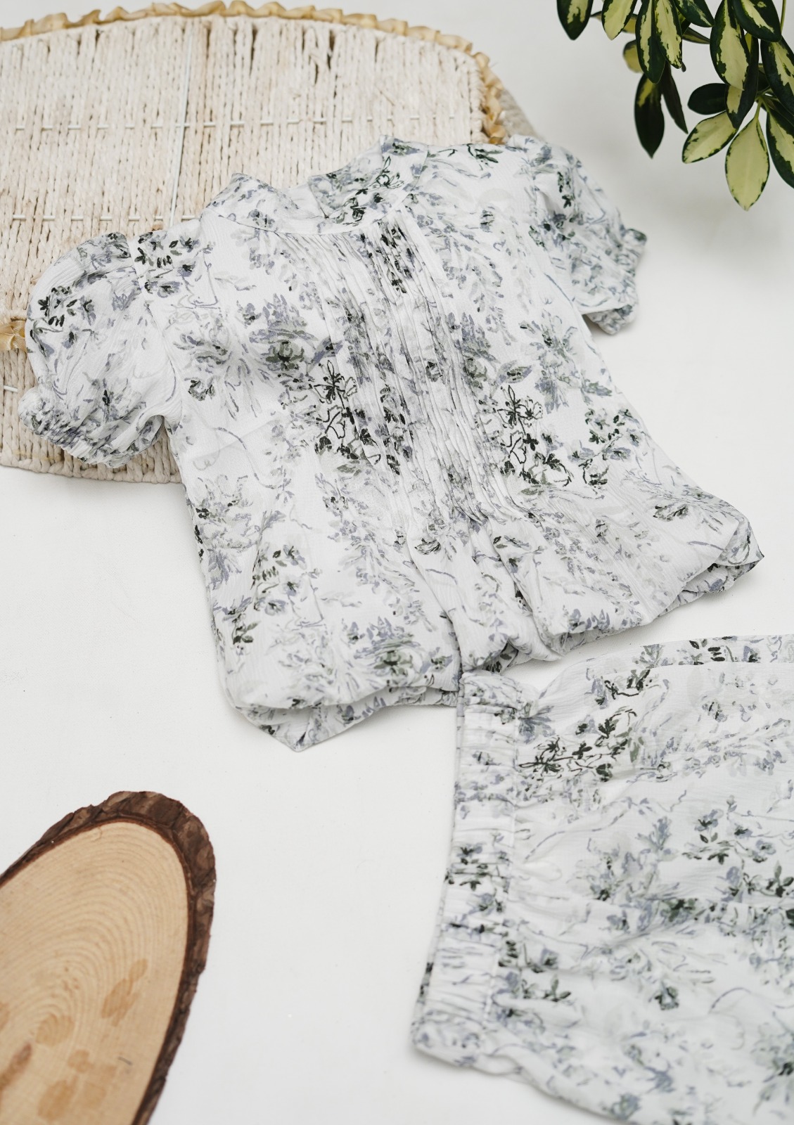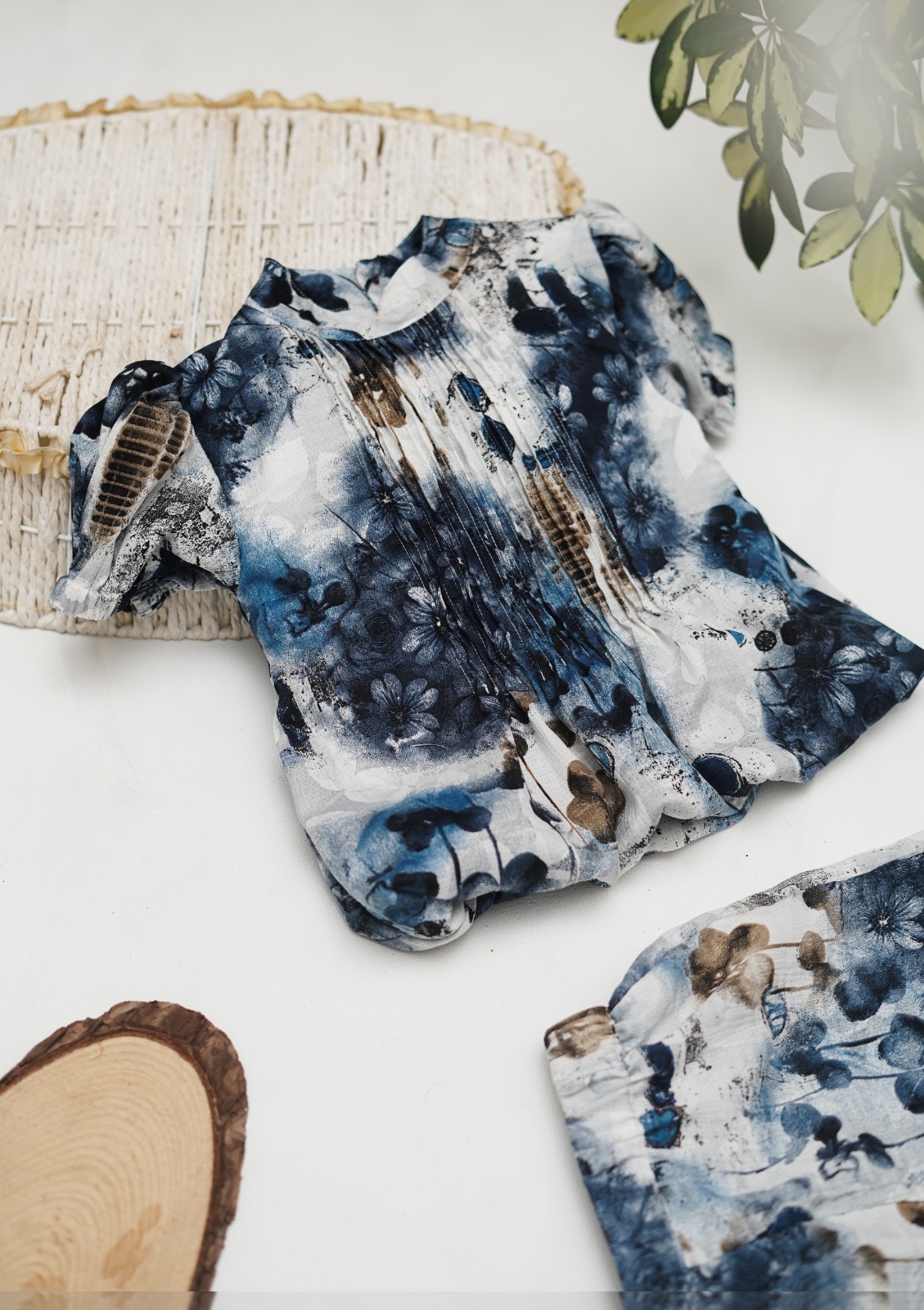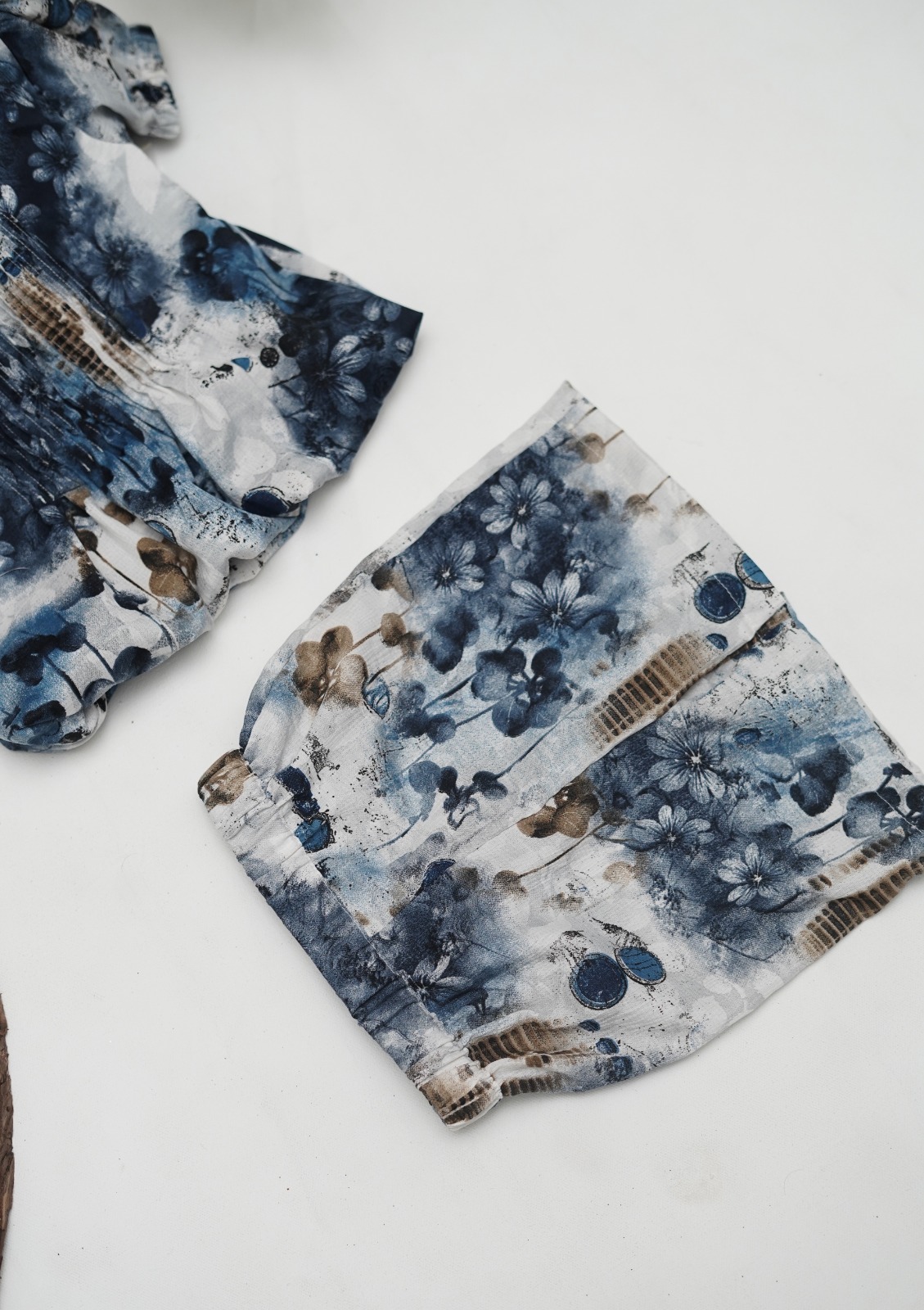 Available in both light floral patterns and bold blue prints, this two piece set offers versatility. The floral design is soft and subtle, ideal for a feminine everyday look, while the darker shades bring a modern and trendy twist. Whether styled with sandals for a picnic, sneakers for a playdate, or layered with a cardigan on cooler evenings, this set transitions easily between occasions.