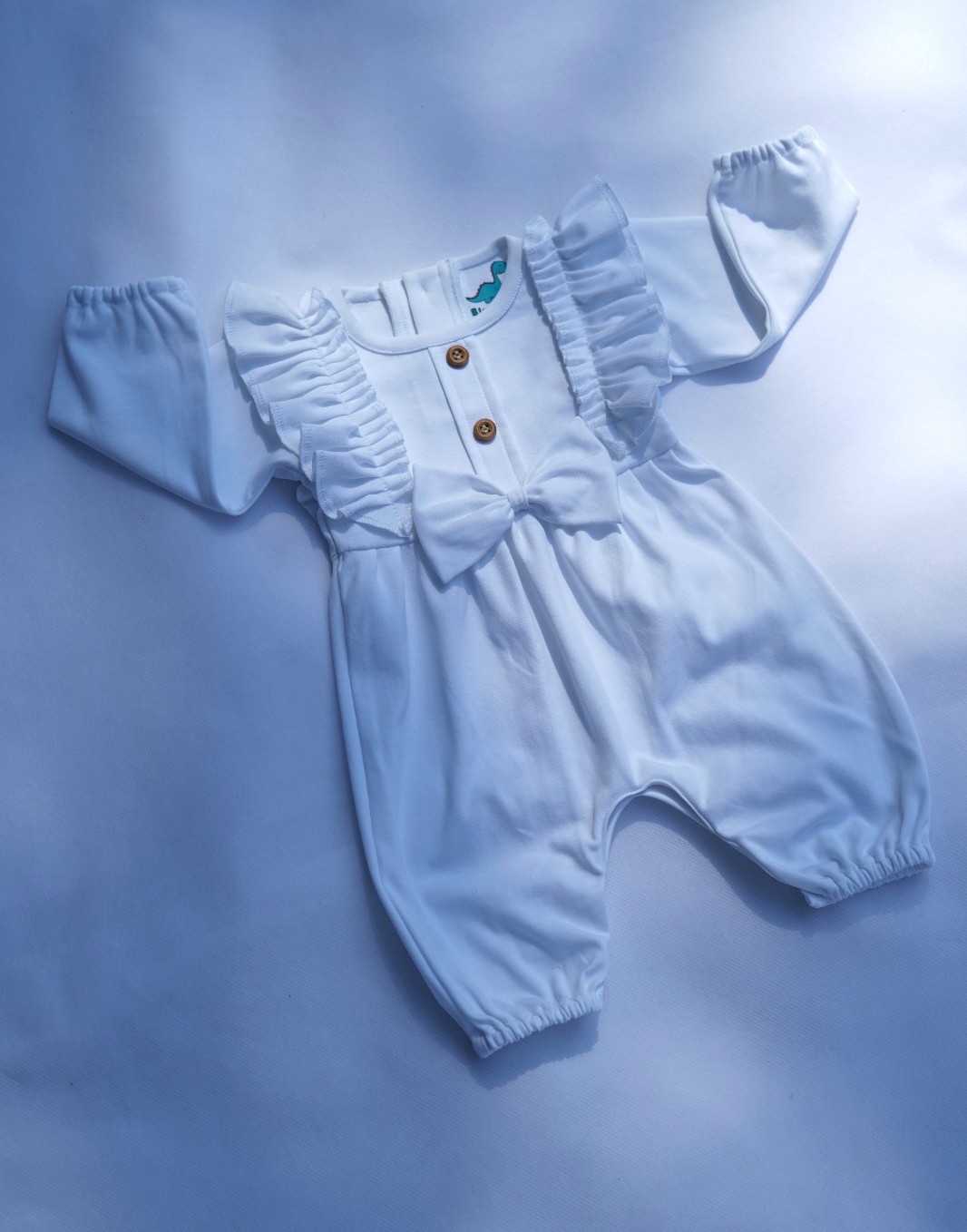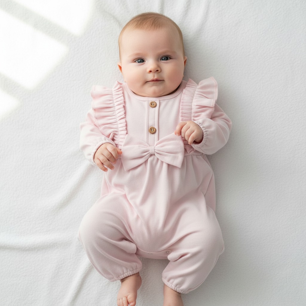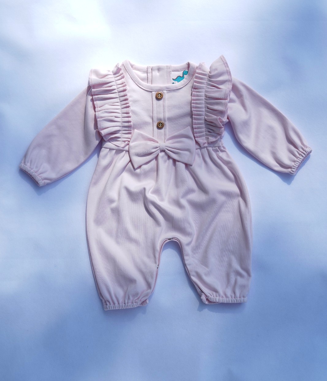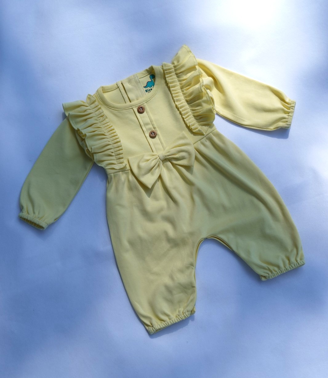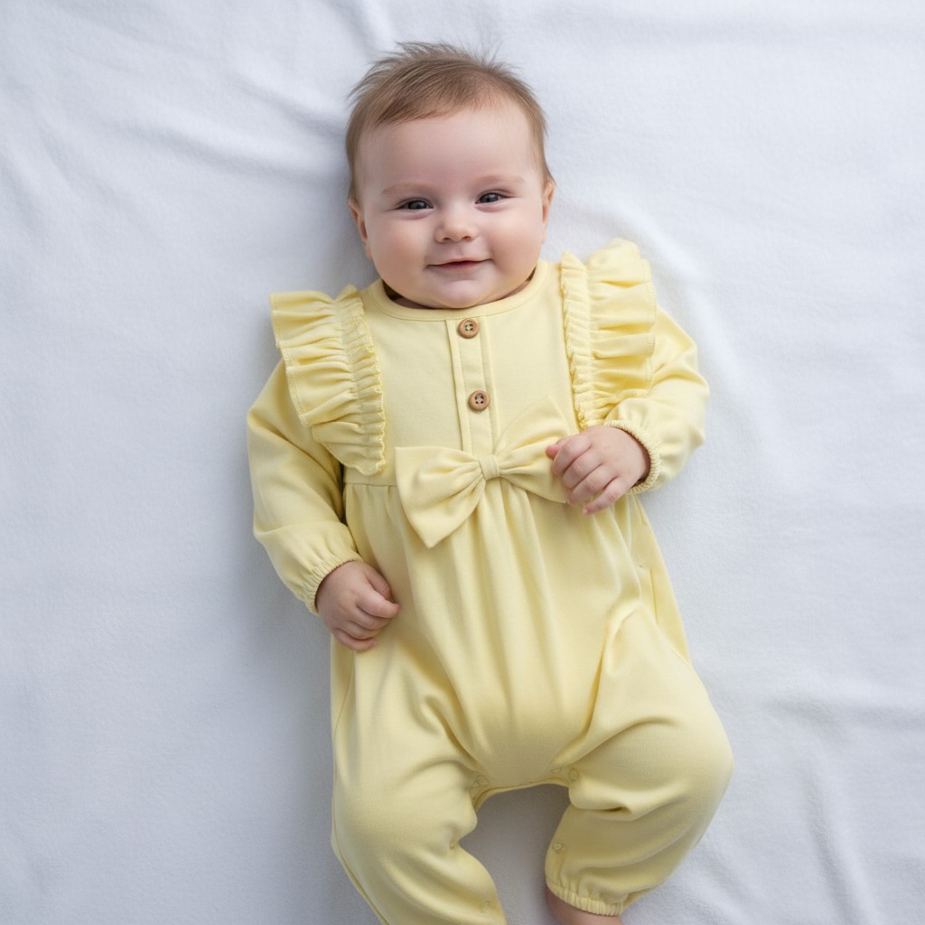 Dress your little one in timeless charm with this beautifully designed baby frill romper set. Crafted for both comfort and style, this outfit features delicate frill detailing along the shoulders and chest, paired with a cute front bow that adds a soft, elegant touch. The design is simple yet eye-catching, making it perfect for everyday wear as well as special occasions.