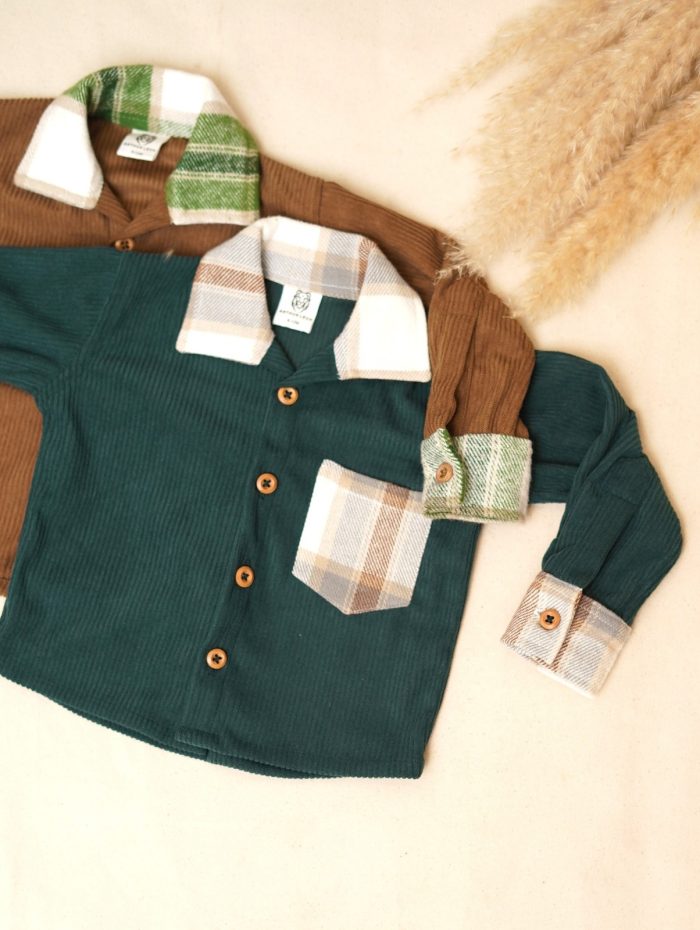 The kids corduroy shirt features a classic collar with contrast checked fabric that extends to the cuffs and chest pocket, creating a coordinated and stylish look. The front button closure allows for easy dressing and also adds a clean, timeless finish. Furthermore, the curved hemline enhances the overall silhouette, making it suitable for both casual and semi-dress occasions. This versatile piece pairs effortlessly with jeans, trousers, or matching corduroy bottoms, making it a reliable choice for outings, gatherings, or everyday wear. Because of its thoughtful design and quality fabric, this corduroy shirt works well across seasons while remaining easy to maintain. Overall, it serves as a practical yet stylish wardrobe essential that blends comfort, durability, and classic design for growing kids.