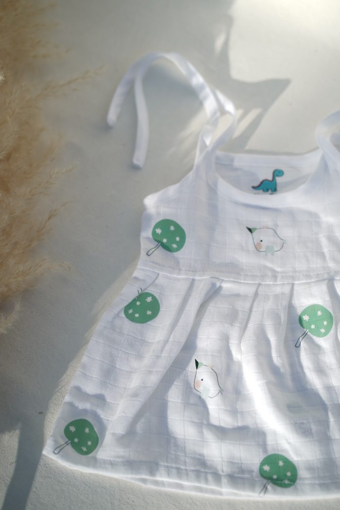 Keep your little one cool and cheerful in this muslin cotton baby frock. Crafted from soft, breathable muslin fabric, it ensures all-day comfort even in warm weather. The sleeveless design allows easy movement, while the tie-up shoulder straps provide an adjustable fit that grows with your baby.