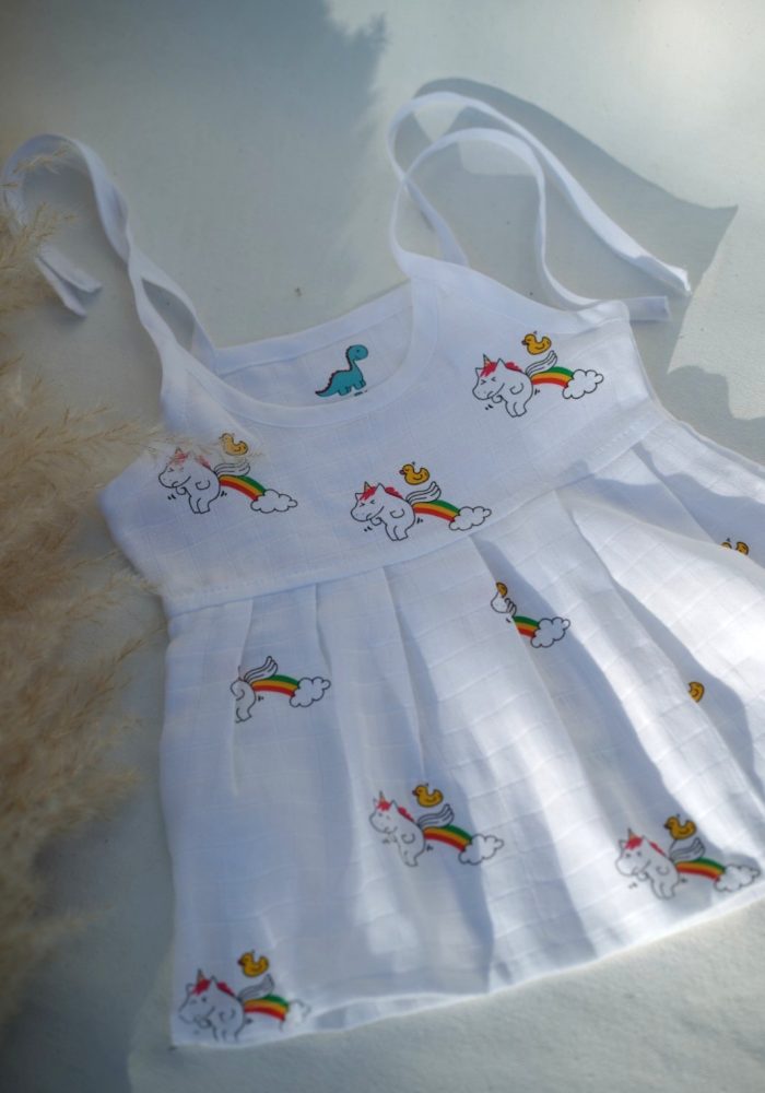 Make your little one’s day magical with this adorable unicorn print baby frock. Crafted from soft muslin cotton, it ensures breathability and comfort throughout warm weather. The white fabric features colorful unicorns and rainbows, adding a fun, cheerful look that brightens every occasion.