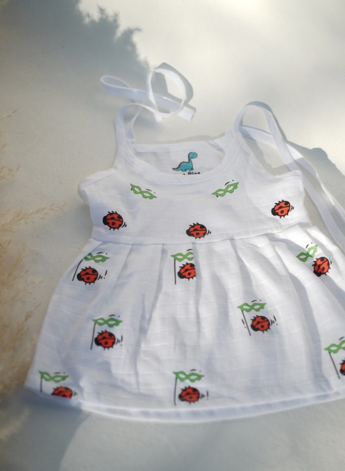 This white muslin cotton frock for girls features a sleeveless design with adorable tie-up shoulder straps. The adjustable straps allow for a better fit as your baby grows. Moreover, the gathered flare adds a touch of charm and playfulness, while the bright all-over print gives it a cheerful look. In addition, the breathable muslin cotton keeps your little one cool and happy throughout the day.